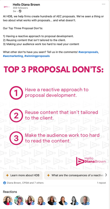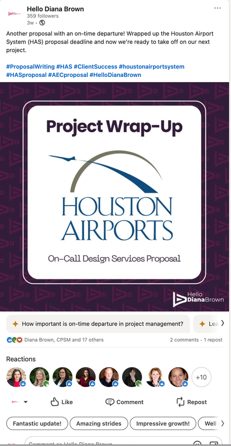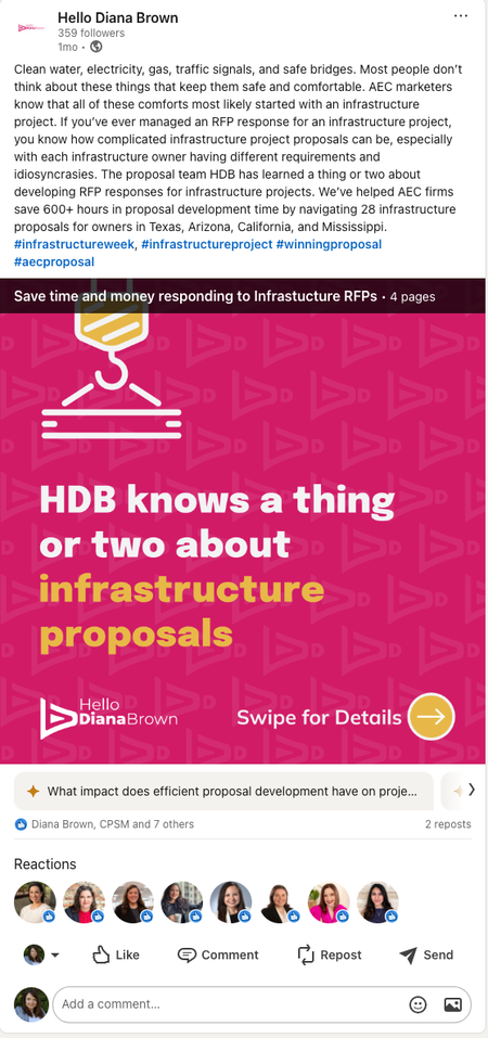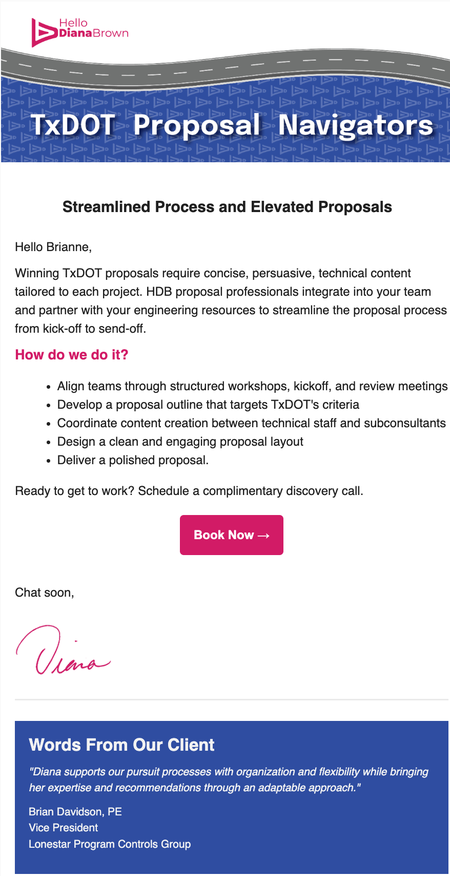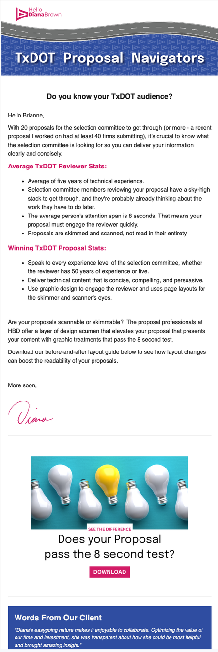 Campaign targeted to increase awareness in my client's TxDOT proposal vertical. The campaign has resulted in a 25% increase in TxDOT clients for Q4 2024.